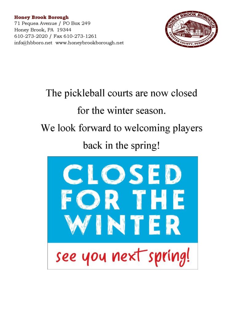 The pickleball courts are closed for the winter season. https://honeybrookborough.net/the-pickleball-courts-are-now-closed-for-the-winter-season-courts-will-reopen-in-the-spring-weather-permitting/ Thu, 26 Feb 2026 15:12:26 +0000 https://honeybrookborough.net/?p=4234 The pickleball courts are now closed for the winter season. The courts will reopen in the spring, weather permitting.