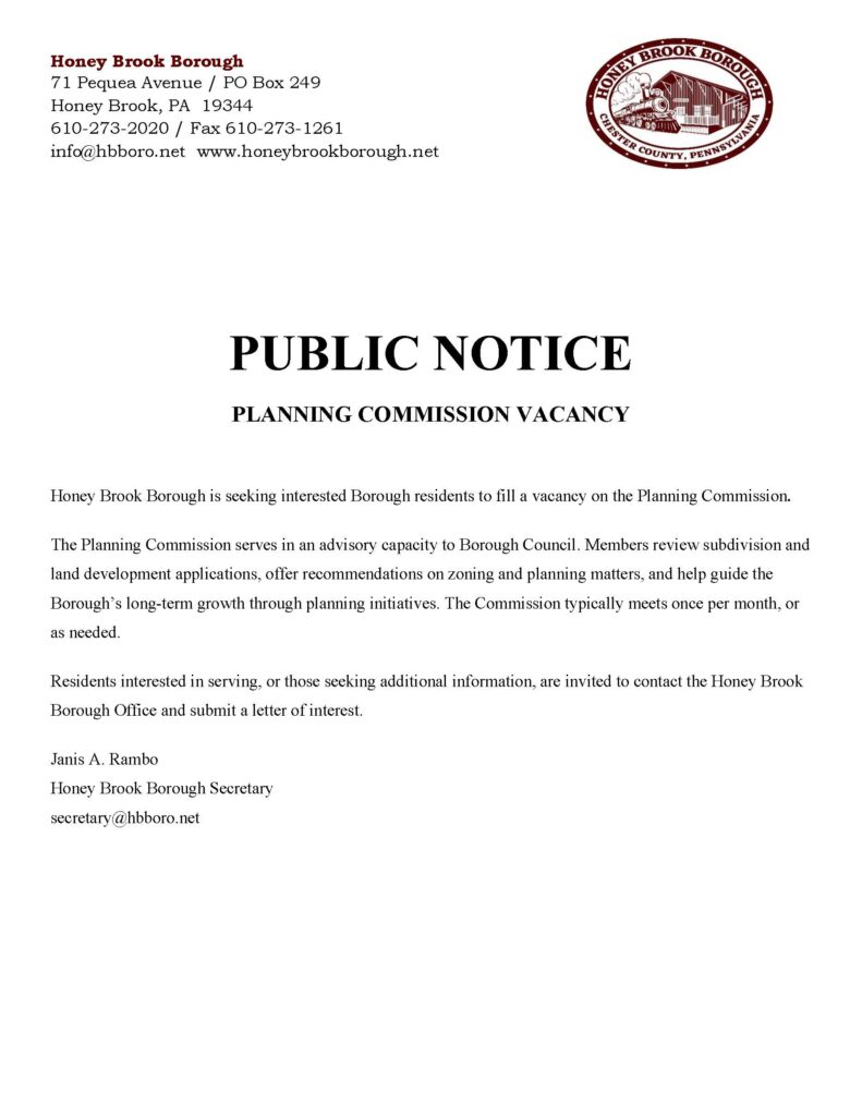 PUBLIC NOTICE PLANNING COMMISSION VACANCY https://honeybrookborough.net/public-notice-planning-commision-vacancy/ Wed, 14 Jan 2026 14:49:14 +0000 https://honeybrookborough.net/?p=4263 Honey Brook Borough is seeking interested Borough residents to fill a vacancy on the Planning Commission.