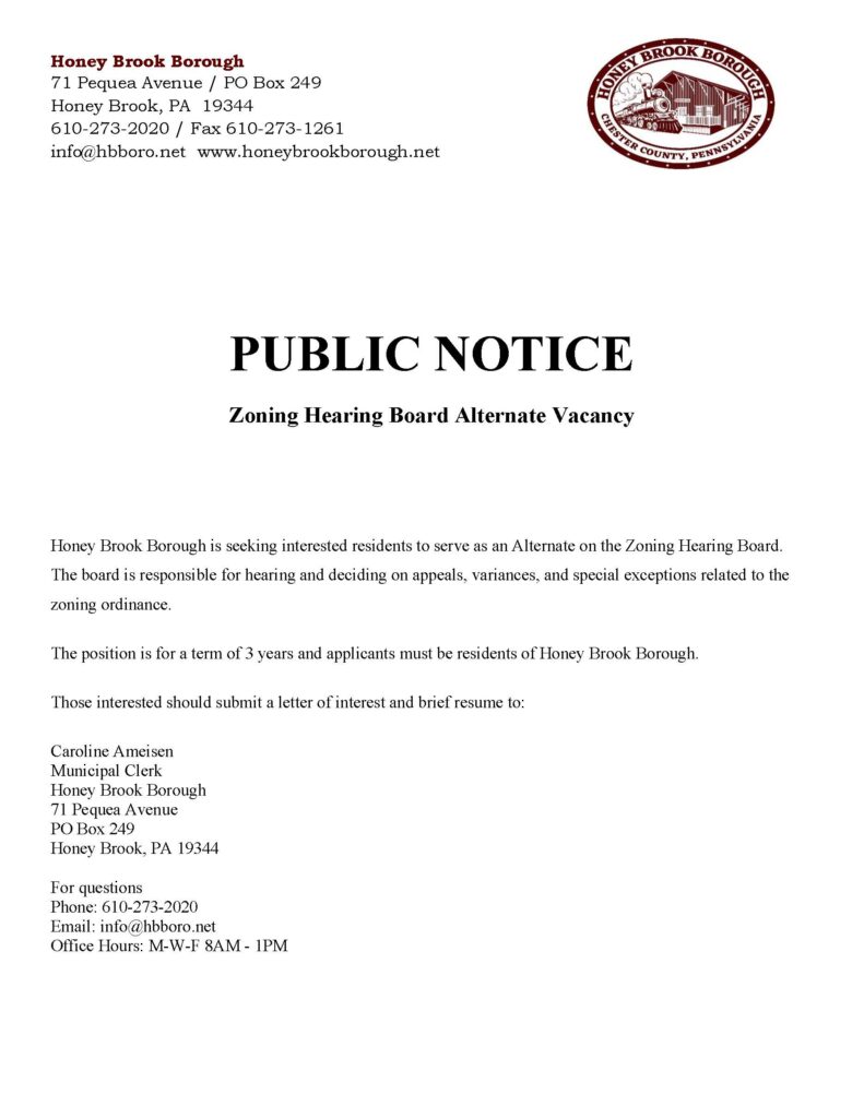 PUBLIC NOTICE ZONING HEARING BOARD ALTERNATE VACANCY https://honeybrookborough.net/public-notice-alternate-vacancy/ Wed, 14 Jan 2026 14:47:05 +0000 https://honeybrookborough.net/?p=4259 Zoning Hearing Board Alternate Vacancy