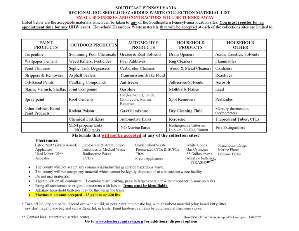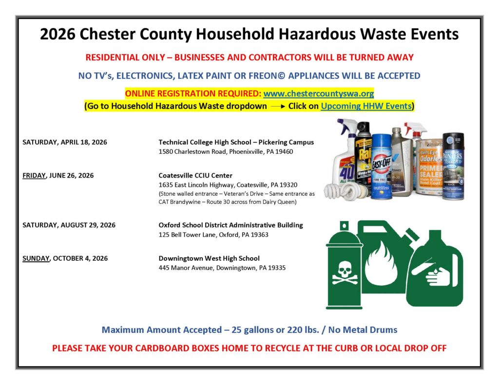 ONLINE REGISTRATION REQUIRED: https://www.chestercountyswa.org/121/Upcoming-Household-Hazardous-Waste-Event