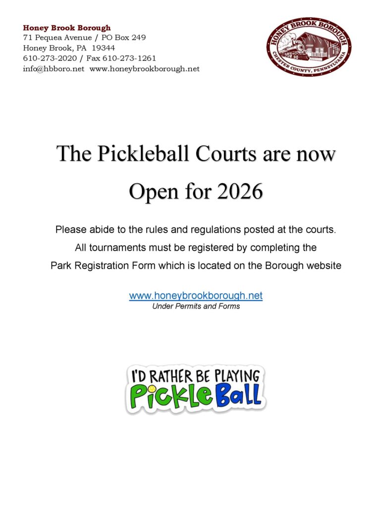 PICKLEBALL COURTS ARE NOW OPEN https://honeybrookborough.net/pickleball-courts-are-now-open/ Mon, 30 Mar 2026 14:48:41 +0000 https://honeybrookborough.net/?p=4500 ]]> 2026 Chester County Household Hazardous Waste Events https://honeybrookborough.net/2026-chester-county-household-hazardous-waste-events/ Mon, 23 Mar 2026 12:22:17 +0000 https://honeybrookborough.net/?p=4470 RESIDENTIAL ONLY – BUSINESSES AND CONTRACTORS WILL BE TURNED AWAY